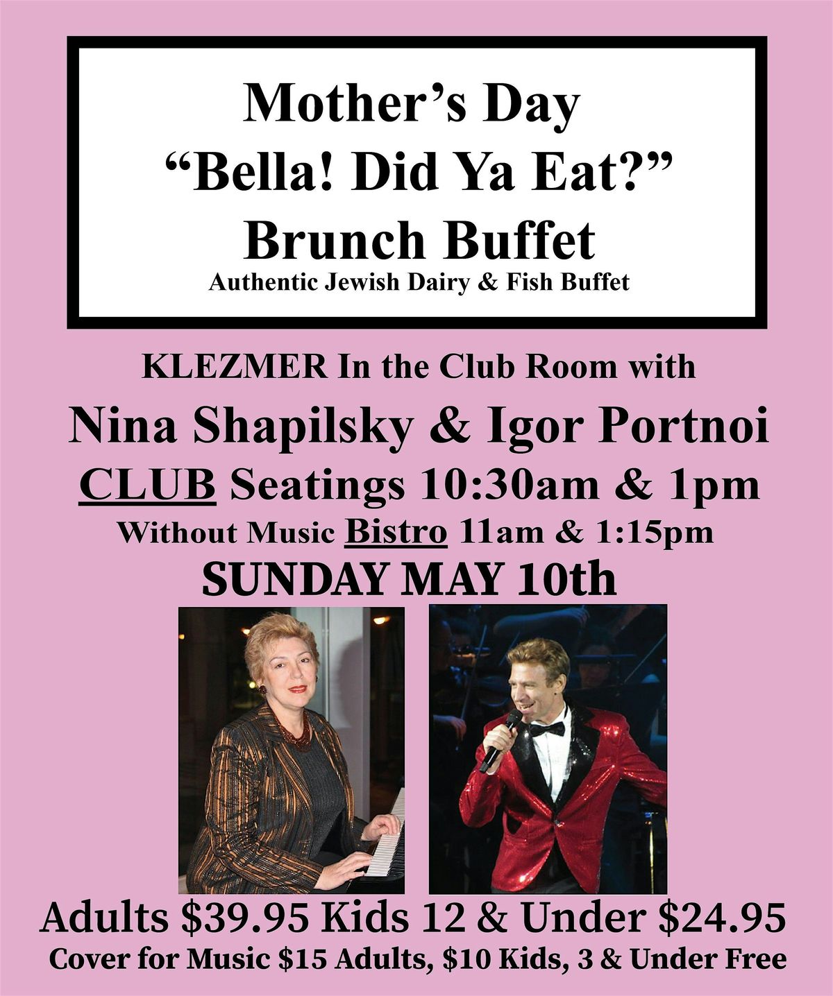 *Come see this special show of broadway, klezmer and jazz classics they play ONLY ONCE A YEAR on Mother's Day! It will be a brunch to remember!