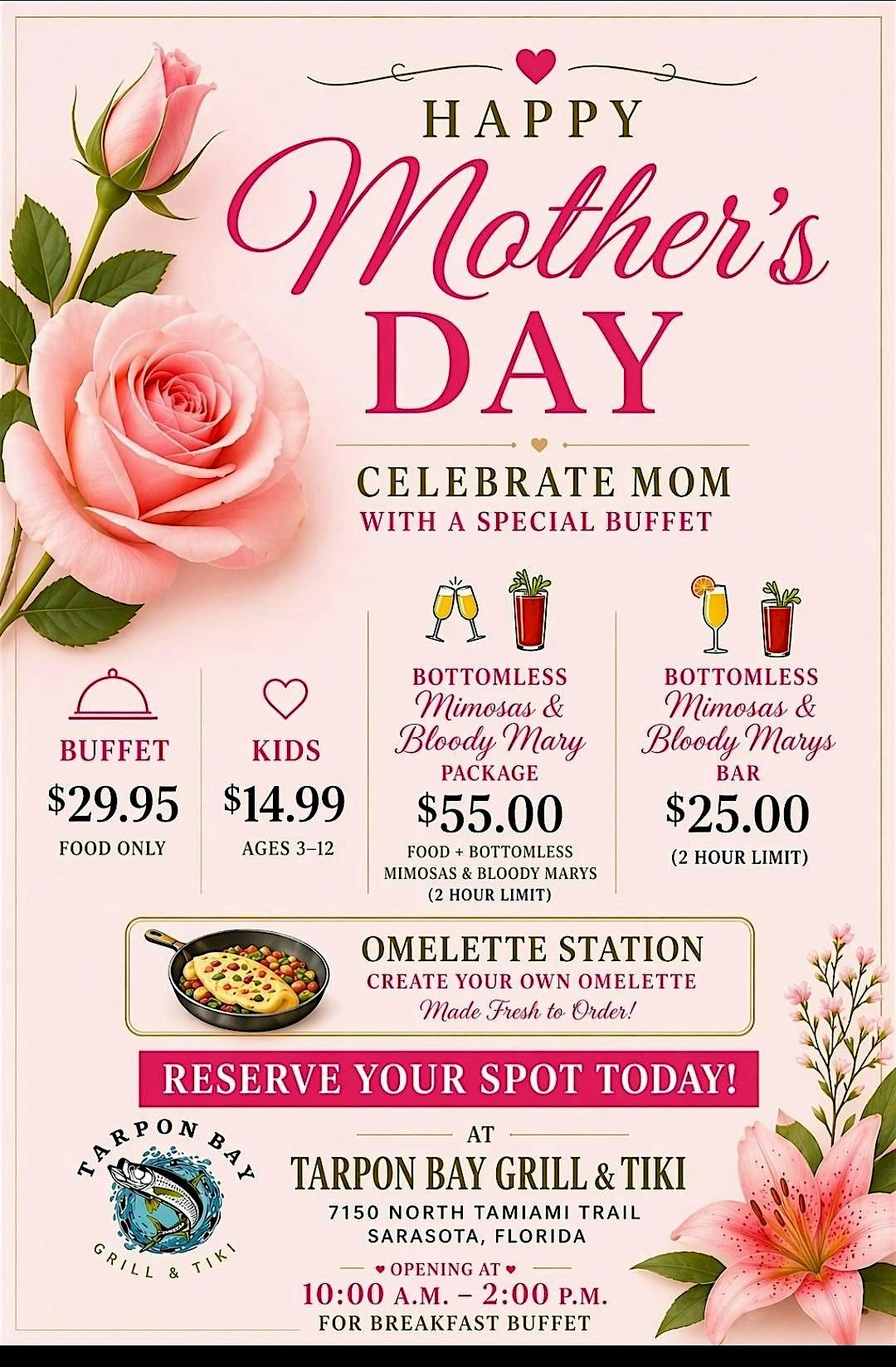 Celebrate Mother’s Day the way she deserves at Tarpon Bay Grill & Tiki! 🌸 Enjoy a beautiful waterfront buffet, sip on bottomless mimosas, and build the perfect Bloody Mary at our loaded Bloody Mary Bar. Delicious food, tropical vibes, and the best views in town — this is the place to be for Mother’s Day! 💐🥂