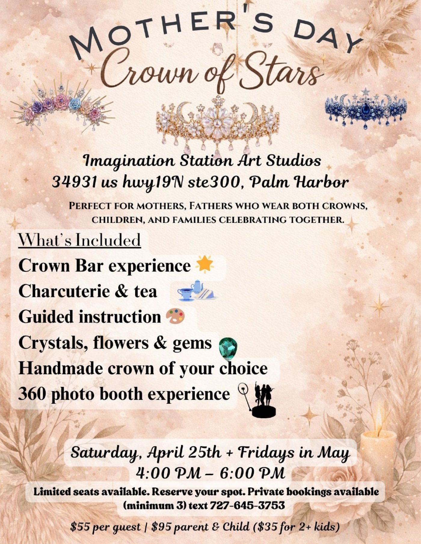 Celebrate the queens in our lives — and the fathers who proudly wear both crowns.Create a celestial crown using crystal roses, moons, stars, and sparkling gems at our magical Crown Bar inside the Starlight Sanctuary.Perfect for mothers, children, and families celebrating together.