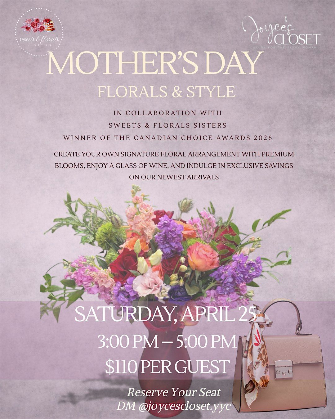 In collaboration with Sweets & Florals Sisters (Canadian Choice Awards 2026 Winner), guests will enjoy a beautifully curated floral workshop paired with a signature Joyce’s Closet experience.