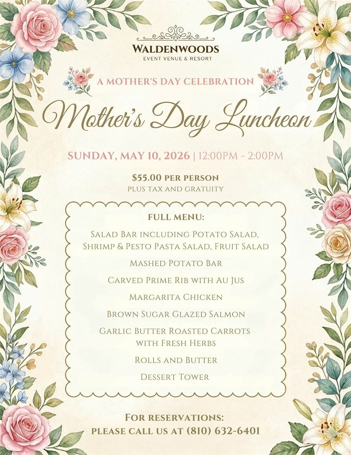 Join us on Sunday, May 10, 2026 from 12:00 PM – 2:00 PM for a thoughtfully prepared buffet-style luncheon featuring a variety of fresh salads, chef-carved meats, savory entrées, and sweet desserts.