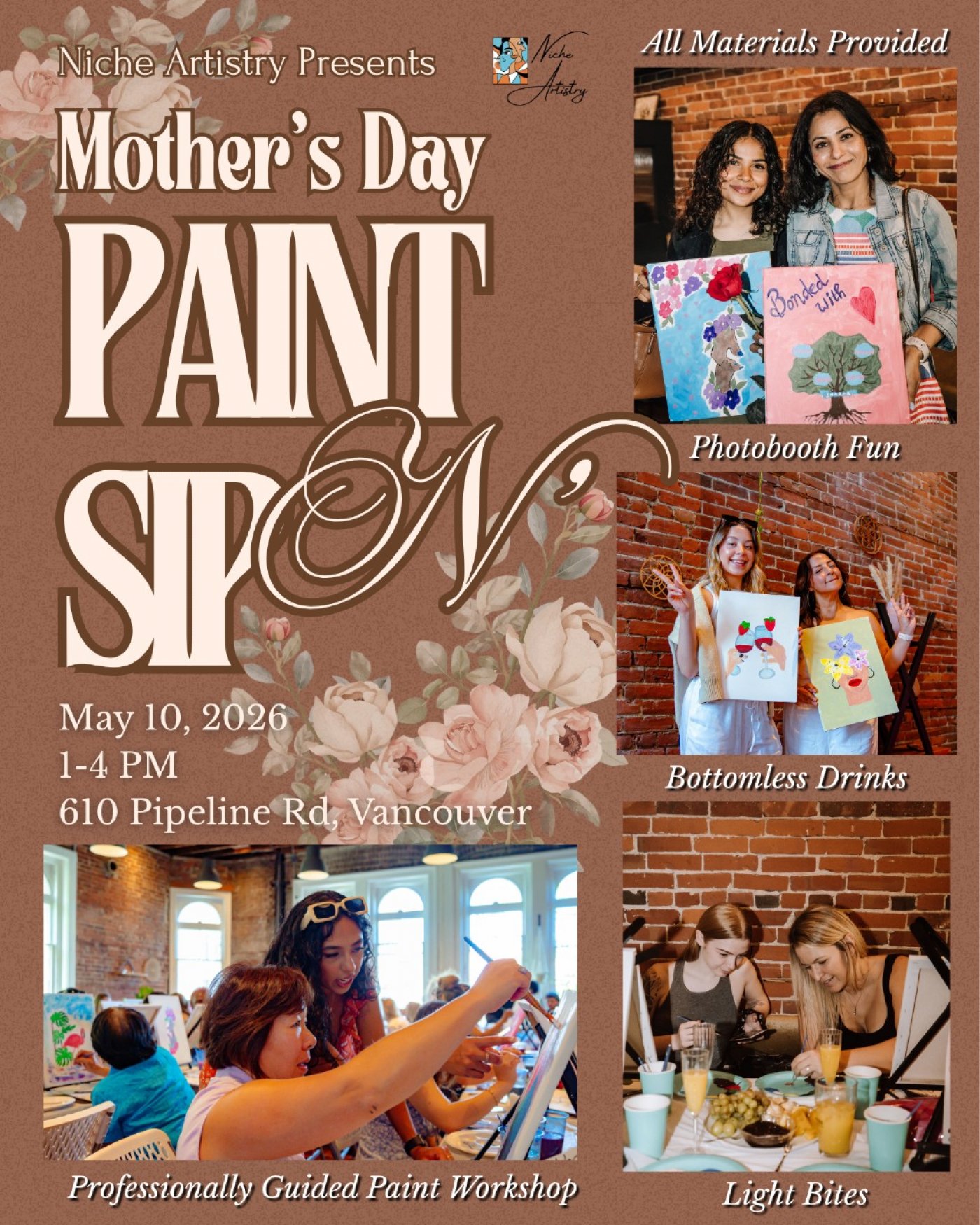 Celebrate the incredible mothers and mother figures in your life with a beautiful afternoon of creativity, connection, and celebration at our Mother’s Day Paint N’ Sip hosted by Niche Artistry.