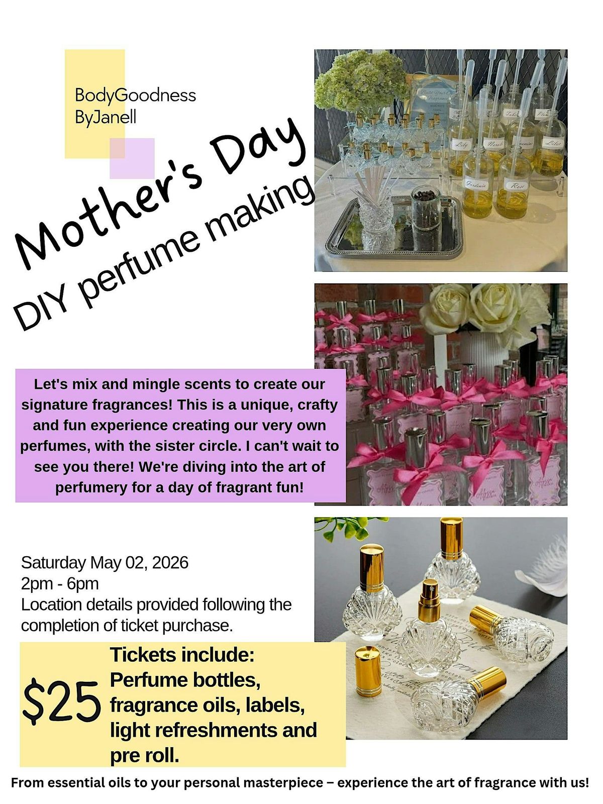 Join us at the Local park on May 2, 2026 at 2:00 PM for a fun, laid-back, relaxing afternoon crafting your own unique scents. It’s the perfect way to celebrate Mother's Day, getting creative together. Bring your mom, sisters, daughters, friends and enjoy nature, music, good vibes, food and conversation while making memories and amazing perfumes! Park address and information given with icket purchase.