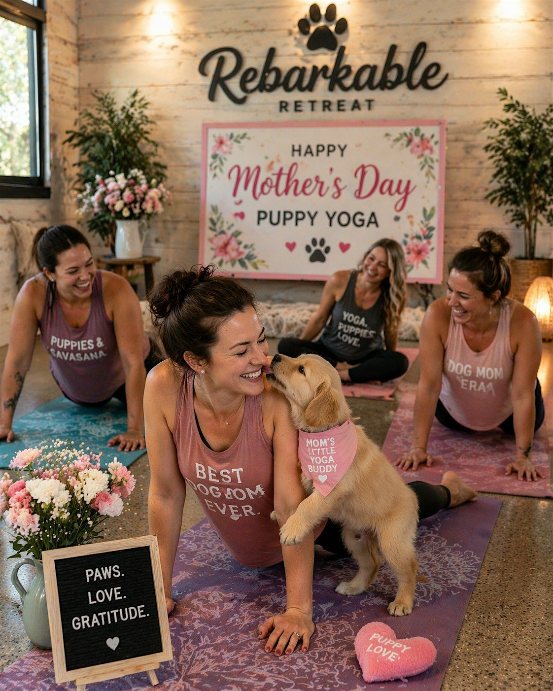 Mother’s Day Puppy Yoga at Rebarkable Retreat 🐾🧘♀️🌸