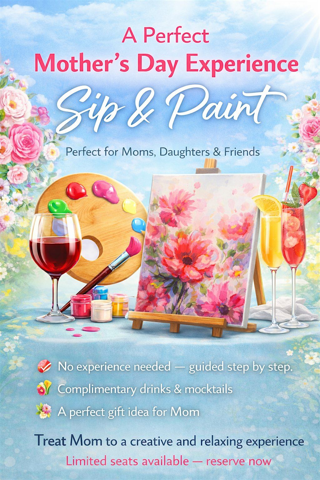 Celebrate Mother’s Day with a relaxing sip and paint experience. Enjoy a fun, laid-back atmosphere with guided painting, complimentary drinks and mocktails, and good vibes.
