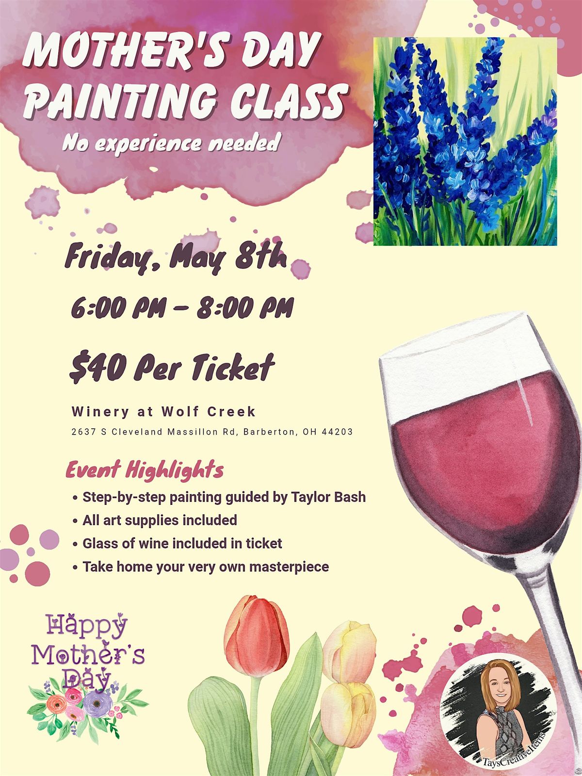 Join us for a fun time with your mom. Experiencing something you have never experienced together. Tickets include a glass of wine!