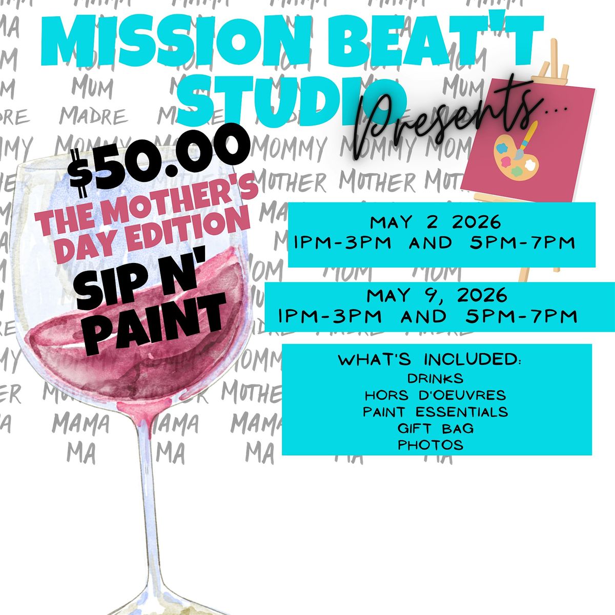 - Gift Bag (Worth $50.00+)This series of events promises to be filled with fantastic energy and a wonderful atmosphere. You'll leave feeling pampered and glad you attended. We offer two sessions each day, allowing you to plan around other activities and still enjoy a fun and creative celebration. So, bring your mom, aunt, and friends to join us for a memorable Mother's Day Sip N' Paint.