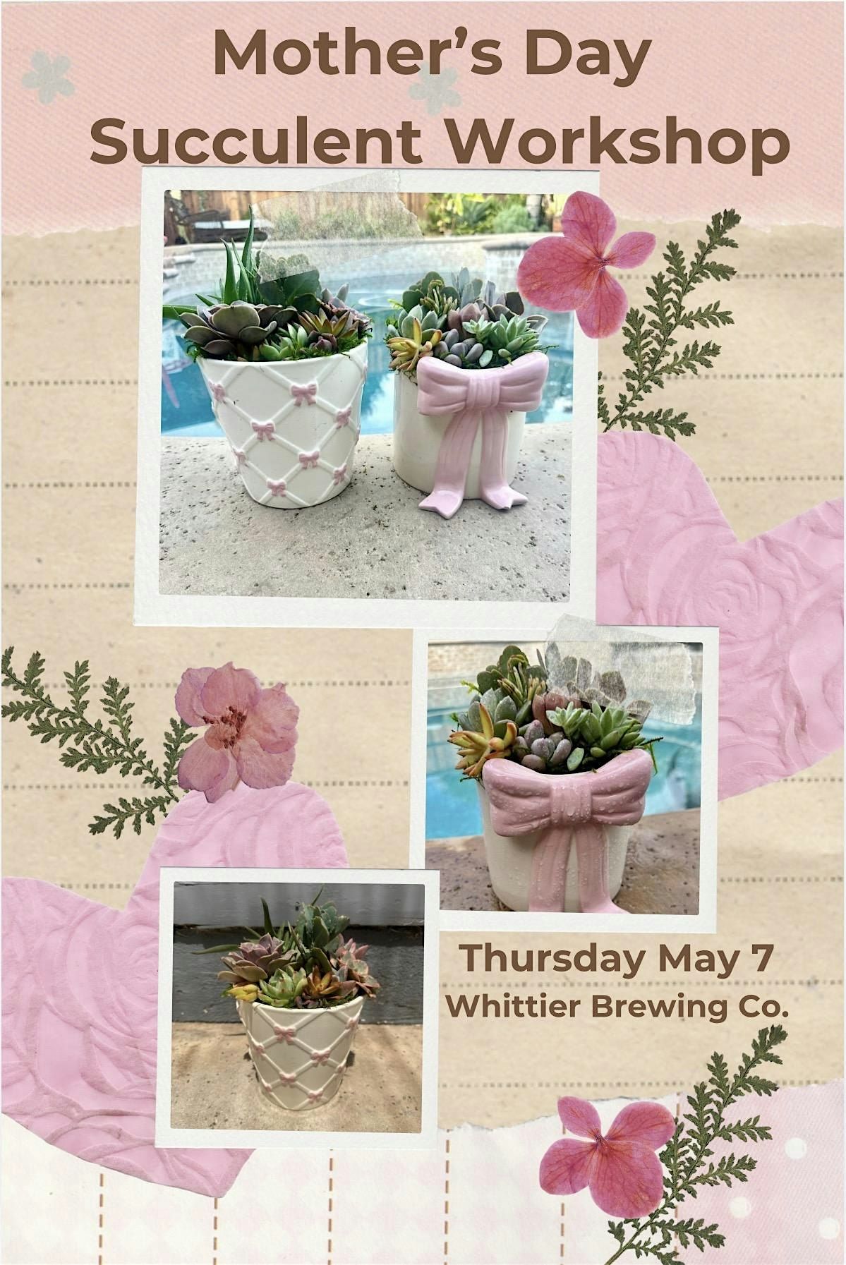 Join us at Whittier Brewing Company on May 7, 2026 at 6:30 PM (Pacific Time) for a fun and relaxed evening! We'll be crafting beautiful succulent ribbon arrangements—perfect for Mother's Day gifts or just to brighten your space. No experience needed, just bring your creativity and good vibes. Can't wait to see you there!