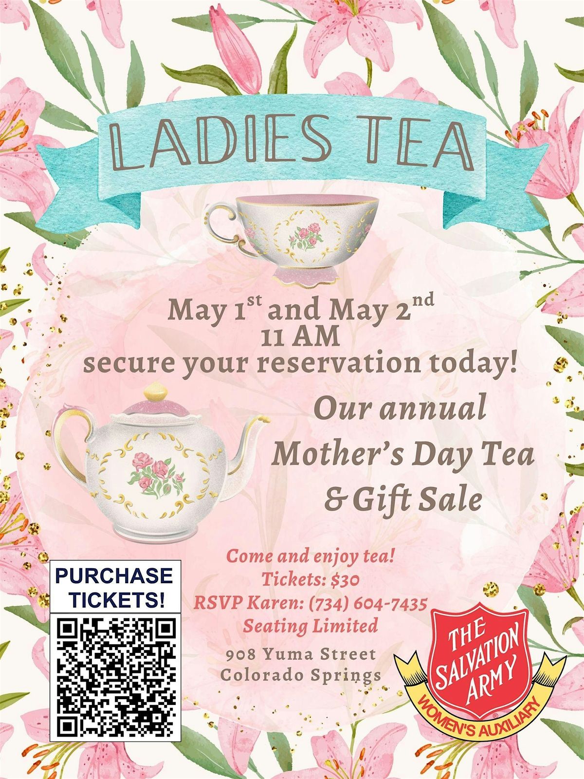 Join us for The Salvation Army's Annual Mother's Day Tea & Gift Sale at 908 Yuma Street. Celebrate the incredible women in your life with a special Ladies Tea on May 1st and 2nd at 11 a.m. Savor delightful teas and enjoy a heartwarming afternoon. Tickets are only $30, and seating is limited. RSVP with Karen at 734-604-7435 or use our QR code to secure your spot today! The Salvation Army looks forward to sharing a memorable time with you!