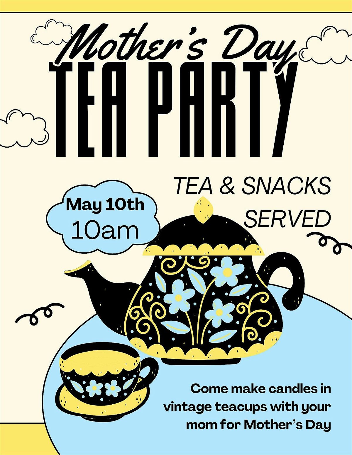 Join us in person for a fun and cozy Mother's Day activity! Get creative as we craft beautiful teacup candles together. It's the perfect way to relax, chat, and make a heartfelt gift for Mom. No experience needed—just bring your lovely self and we'll provide the rest. Let's make memories and candles that shine as bright as Mom's love! Class price includes one vintage teacup per person, wax, fragrence, wick, tea and snacks. Any embellishments desired will be at additional cost.