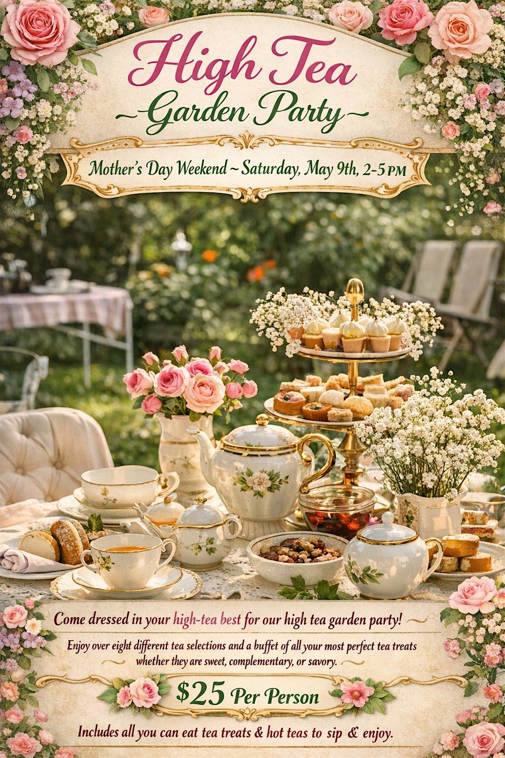 Step into a dreamy garden escape and join us for a Garden Party High Tea Social — an elegant afternoon of tea, treats, and beautiful ambiance.