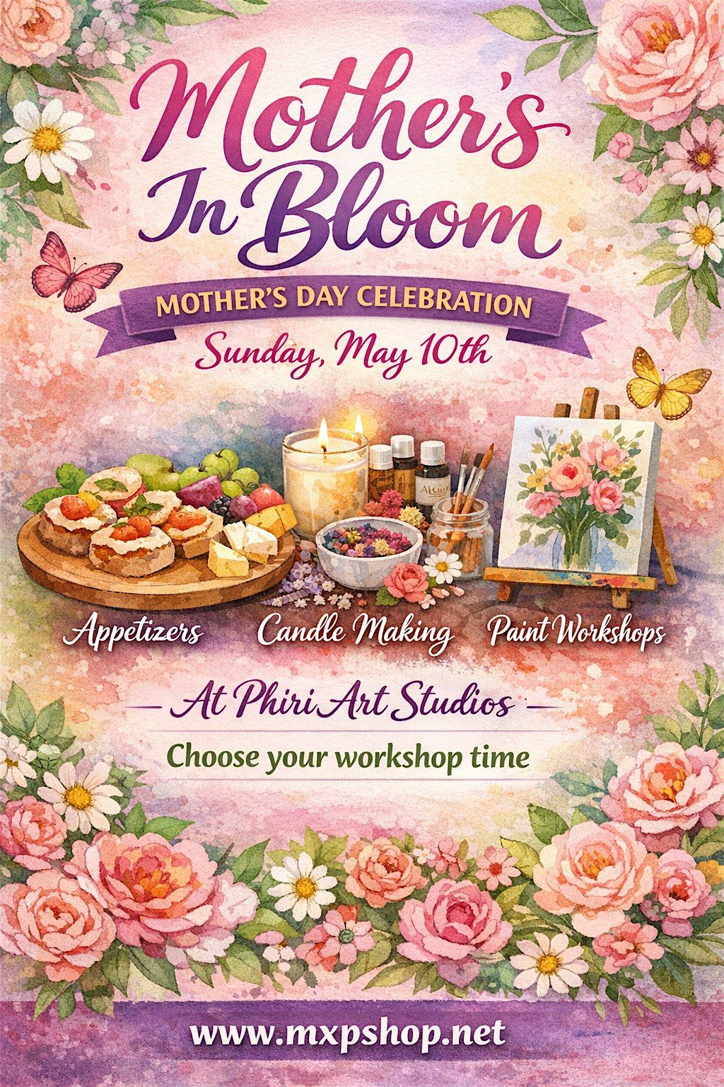 Celebrate Mother’s Day at Mother’s In Bloom 🌸—a creative experience at Phiri Art Studios. Enjoy appetizers, candle making, and paint workshops in a fun, relaxing atmosphere. Choose your workshop time and create something special with mom or for mom.