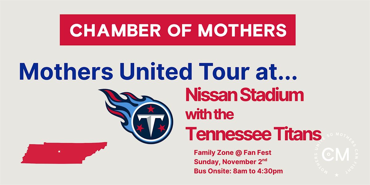 We will be at the Tennessee Titans NFL home game—Titans vs. Chargers—at Nissan Stadium at 12:00 PM. We’ll be positioned near the Family Zone during the game, coinciding with the Titans’ Ladies Flag Football event. Fan Fest is Free to the public, to attend the game purchase tickets HERE | Discount Code: Ticketmasterchamberofmothers.com
