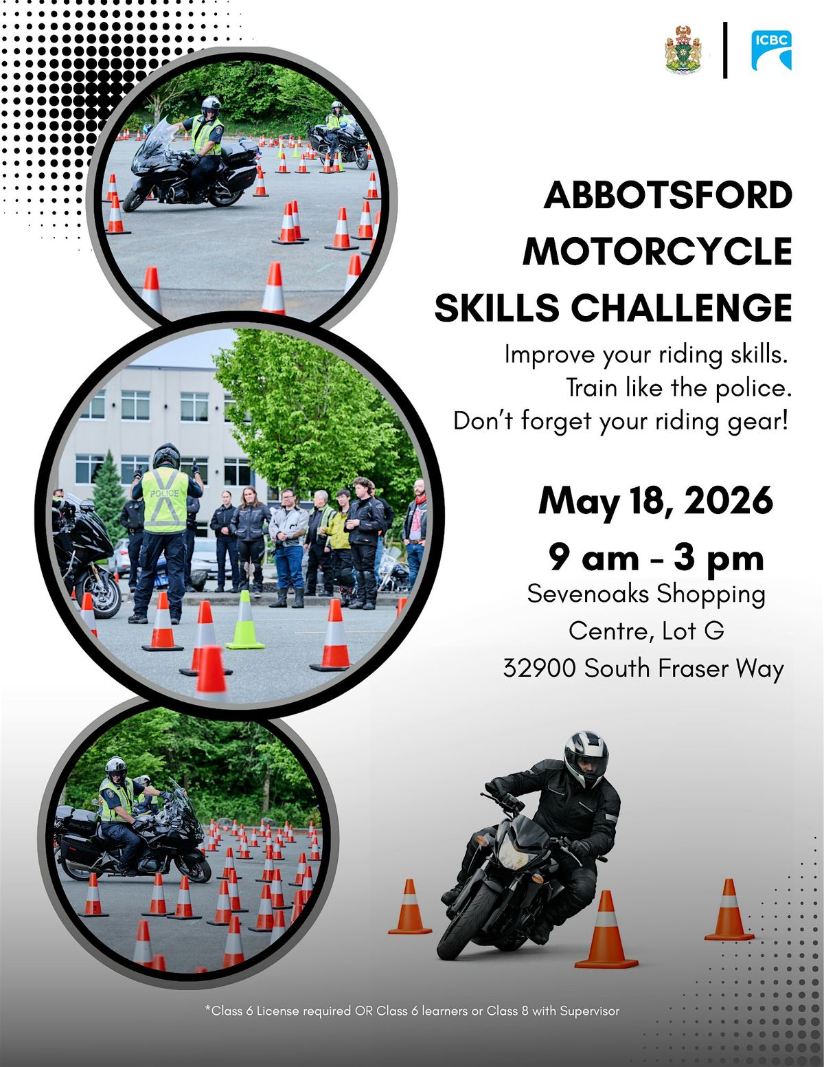 The AbbyPD Traffic Enforcement Unit is hosting a free Motorcycle Skills Challenge on May 18, 2026, from 9 a.m. to 3 p.m. in Abbotsford. It will be hosted in the parking lot at Sevenoaks Shopping Centre (Lot G). Open to the public, the event allows riders to navigate a skills course, connect with police motorcycle riders for tips and feedback, and gain valuable motorcycle safety knowledge from ICBC.