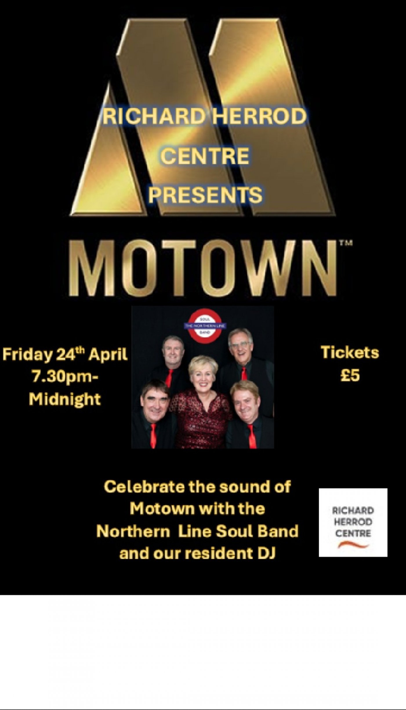 Celebrate the magic of Motown with hits from artist like Smokey Robinson, The Jackson Five and Diana Ross. Featuring the northern line band and resident dj. All tickets to be purchased from the Richard Herrod Centre £5