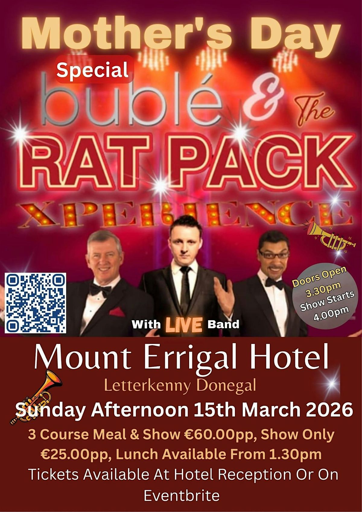 Welcome to the Mount Errigal Hotel for a special event - Mothers Day with Bublé & The Rat Pack Experience! Join us on March 15, 2026 at 3:30 PM for an unforgettable evening filled with fantastic music and great vibes.
