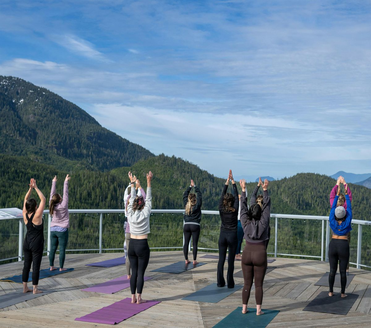 Experience the ultimate outdoor yoga in Squamish. Join us for a rejuvenating Hatha flow yoga class on the Octagon Deck, perched high in the mountains. While you move, enjoy breathtaking 360-degree views of the Howe Sound, surrounding lush forests, and iconic Squamish peaks.