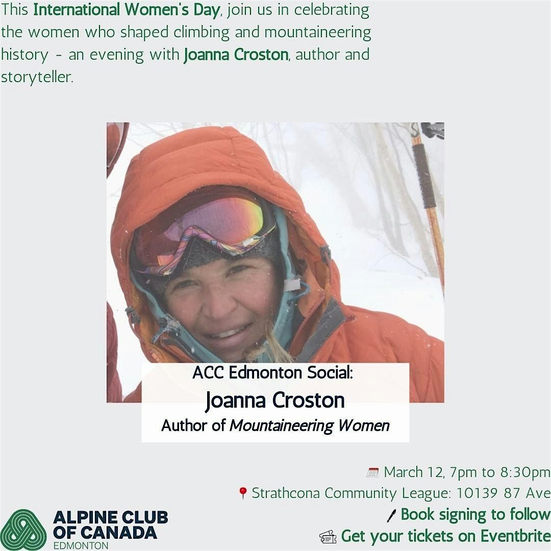 Mountaineering Women with Joanna Croston In celebration of International Women's Day, join author Joanna Croston as she presents Mountaineering Women, a richly illustrated collection of the astonishing and often surprising stories that celebrate the achievements of twenty women climbers, spanning both history and the globe. Even though women have a pronounced and rich history in the sport, they are conspicuously absent from mountaineering literature. As adventure pursuits like climbing and mountaineering continue to gain popularity, women's visibility in those sports has also come under the spotlight. Croston’s book presentation is followed by a Q&A with author and a book signing.