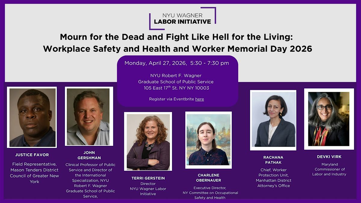Held the day before Worker Memorial Day, this panel will talk about current risks to workplace safety and health - including extreme heat, ergonomic harms at warehouses, and ongoing dangers on construction sites - and we will relate these events to historical context, including the Triangle Shirtwaist fire, in which 146 garment workers died. We will also hear about efforts by government, unions, and nonprofits to improve workplace safety and health. Hosted by the NYU Wagner Labor Initiative.