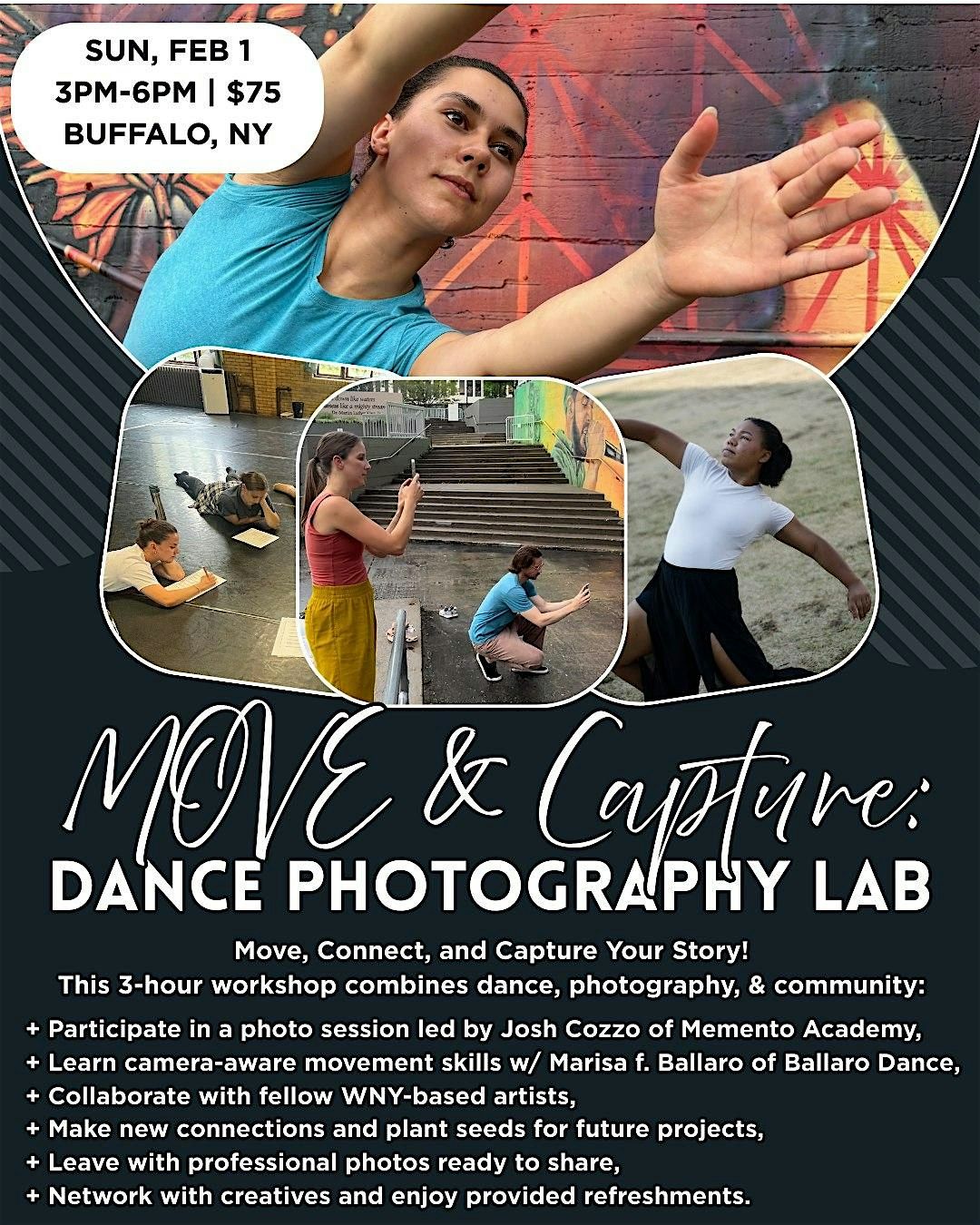 Learn camera-aware movement skills with Marisa f. Ballaro of Ballaro Dance, participate in an introductory photo session led by Josh Cozzo of Memento Academy, and collaborate with fellow artists. Learn how to take photos that highlight your uniqueness and reflect who you are in an image. Leave the session with new connections and professional photos ready to share. The experience includes time for networking with fellow dancers and creatives as well as time for professional dance shots or headshots with Josh! Refreshments are provided.