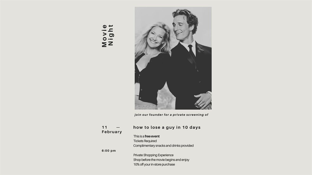 Get ready to laugh, swoon, and maybe make some new friends at Movie Night at Élevée with "How To Lose A Guy In Ten Days"!