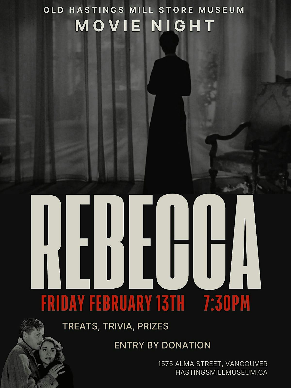 Join us for a screening of Rebecca. Movie Night includes refreshments, trivia, and prizes. Entry by donation.