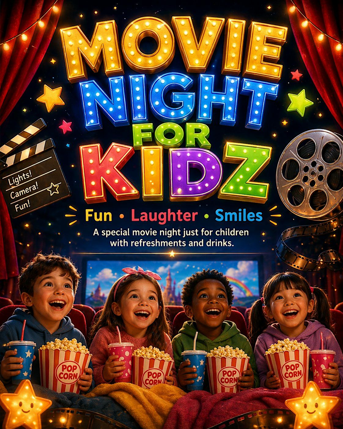 Join us for Movie Night for Kidz, a special event created just for children to enjoy a fun, safe, and exciting movie experience. It will be a wonderful time filled with laughter, entertainment, and happy moments in a warm and friendly atmosphere.