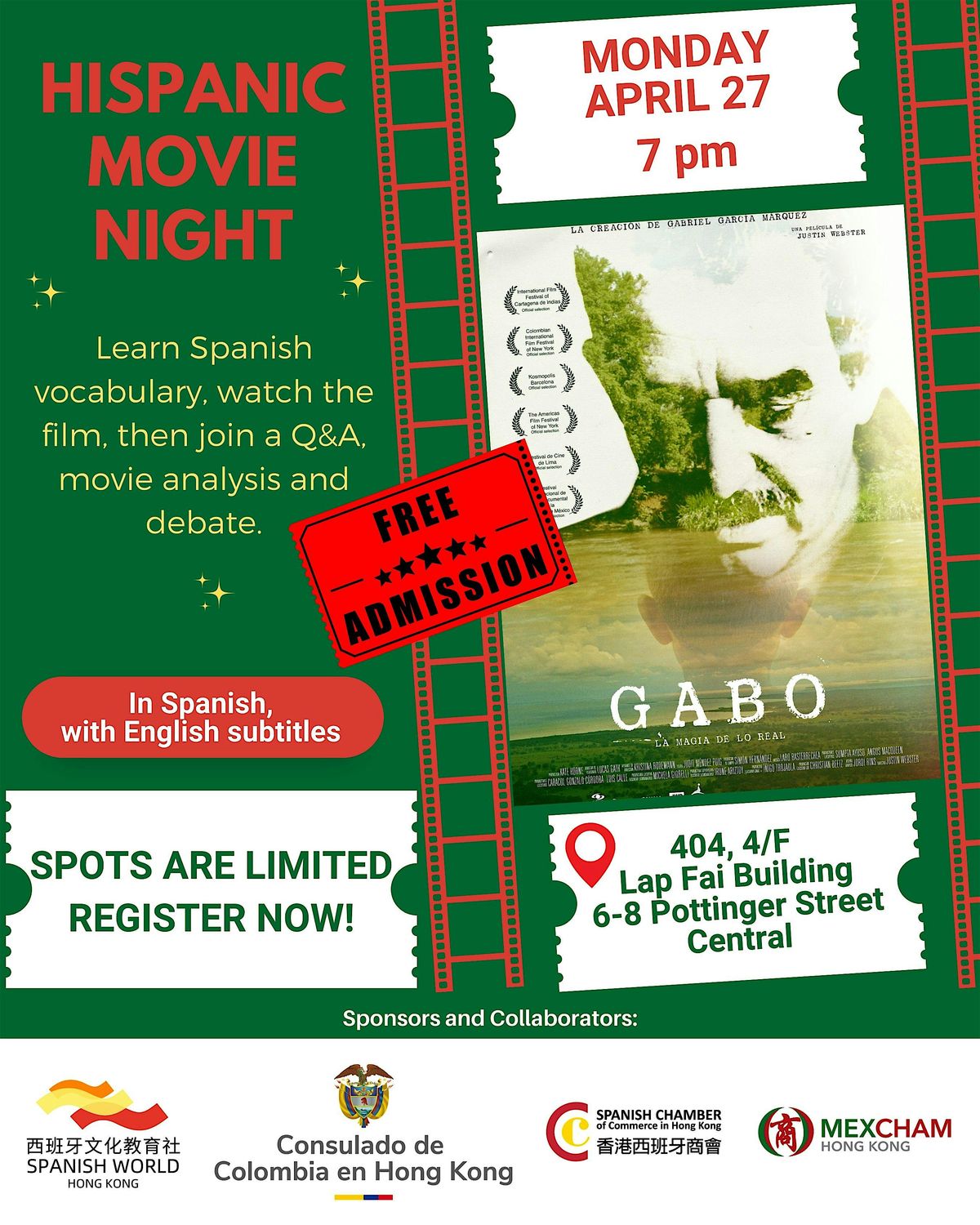 Our next Movie Night features Gabo: The Creation of Gabriel García Márquez! This event is a collaboration between the Consulate General of Colombia in Hong Kong, the Spanish Chamber of Commerce in Hong Kong, the Mexican Chamber of Commerce in Hong Kong and Spanish World HK, the only officially accredited Spanish academy in Hong Kong by Instituto Cervantes.