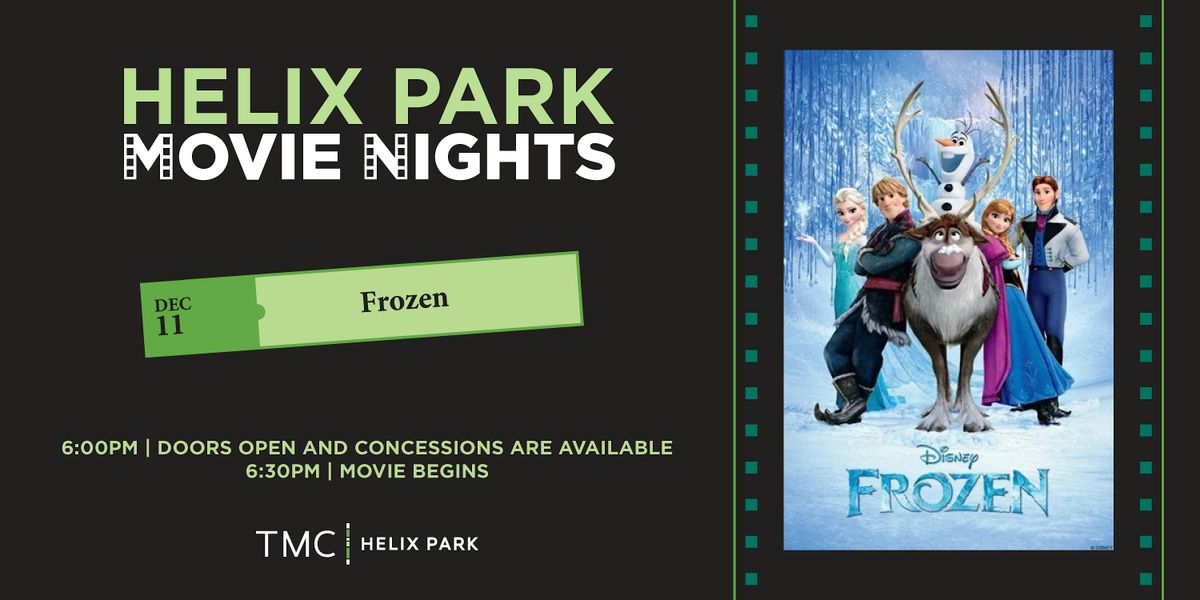 Join us for a magical evening at Helix Park with Disney's Frozen, rated PG! Snuggle up under the stars with fresh popcorn and sweet treats as we follow along with Anna, Elsa, and Olaf in Arendelle on Friday, December 11, 2026. We ask that you please arrive 10-15 minutes early to grab your snacks and find your seat before the movie begins.