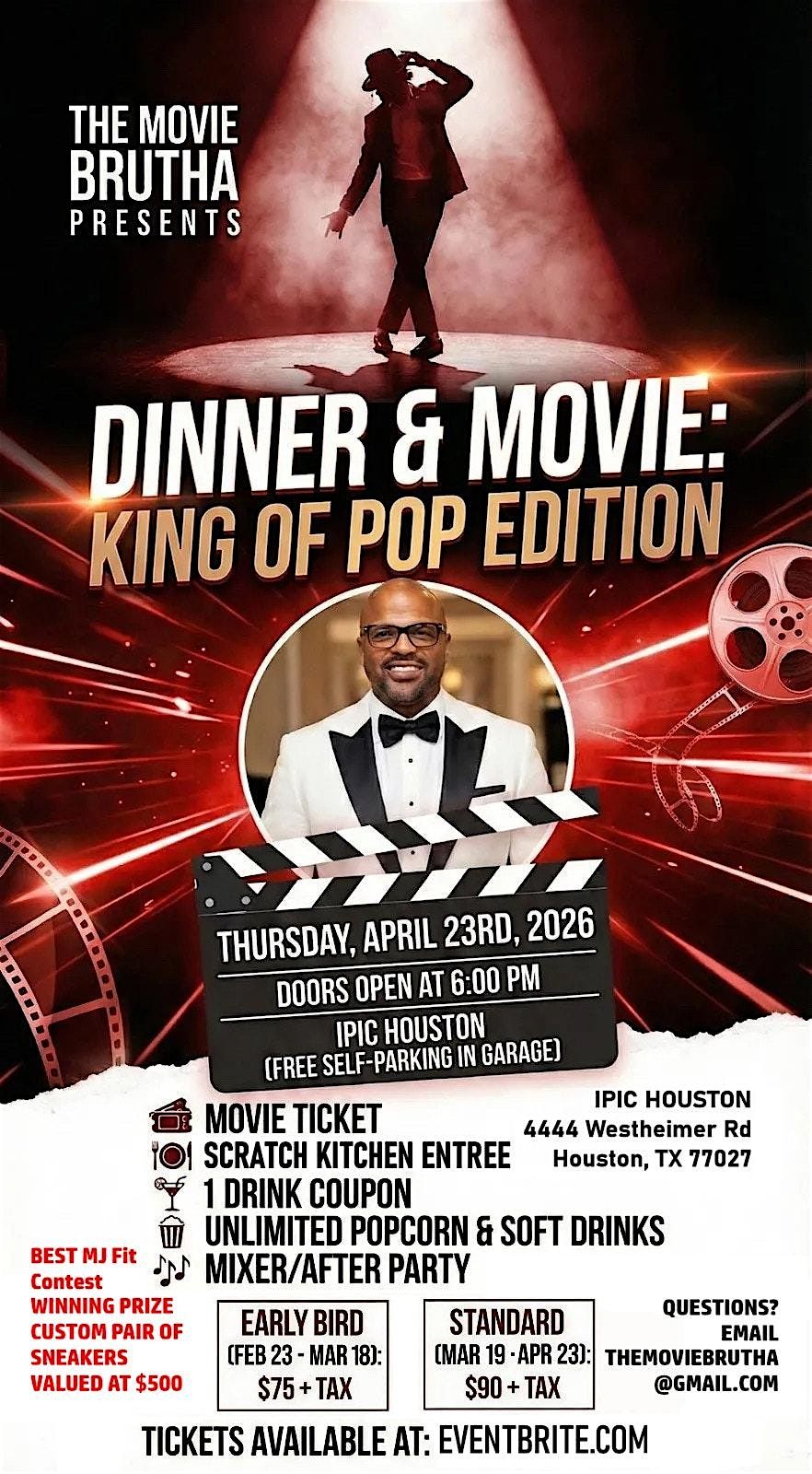 Get ready for an epic in-person movie night celebrating the King of Pop! Join The Movie Brutha for a fun-filled evening of iconic tunes, unforgettable dance moves, and biopic cinematic magic. Whether you're a die-hard fan or just love good vibes, this night is all about paying tribute and having a blast together. Don’t miss out on the ultimate celebration—grab your friends and come through!