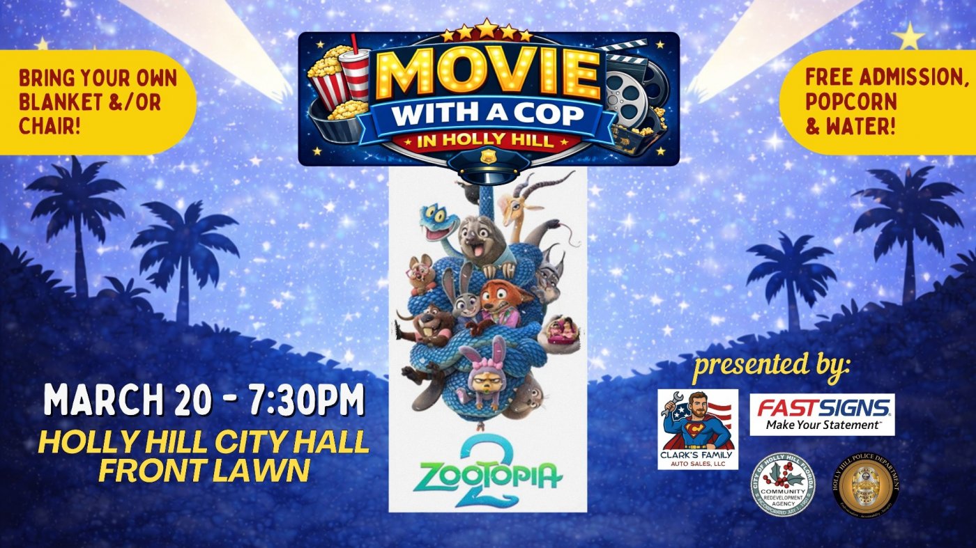 Join the Holly Hill Police Department for a fun, family-friendly evening under the stars at our next Movie with a Cop on March 20 at 7:30 PM!Gather the family, bring your lawn chairs &/or blankets and enjoy a special outdoor showing of Zootopia 2. This event is completely free and open to the community. Free popcorn and water also be provided while supplies last.
