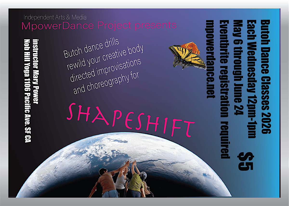 This spring 2026, MpowerDance Project presents fun and affordable Butoh classes, each Wednesday from 12-1pm in San Francisco, starting May 6 through to June 24. Instructor Mary Power will lead us in rewilding our creative body as we transform into an art making exploration in Butoh dance. Expect conditioning drills for shapes, balances, rolls, walks, crawls, spins; and directed Butoh improvisations and choreography for Shapeshift 2026.
