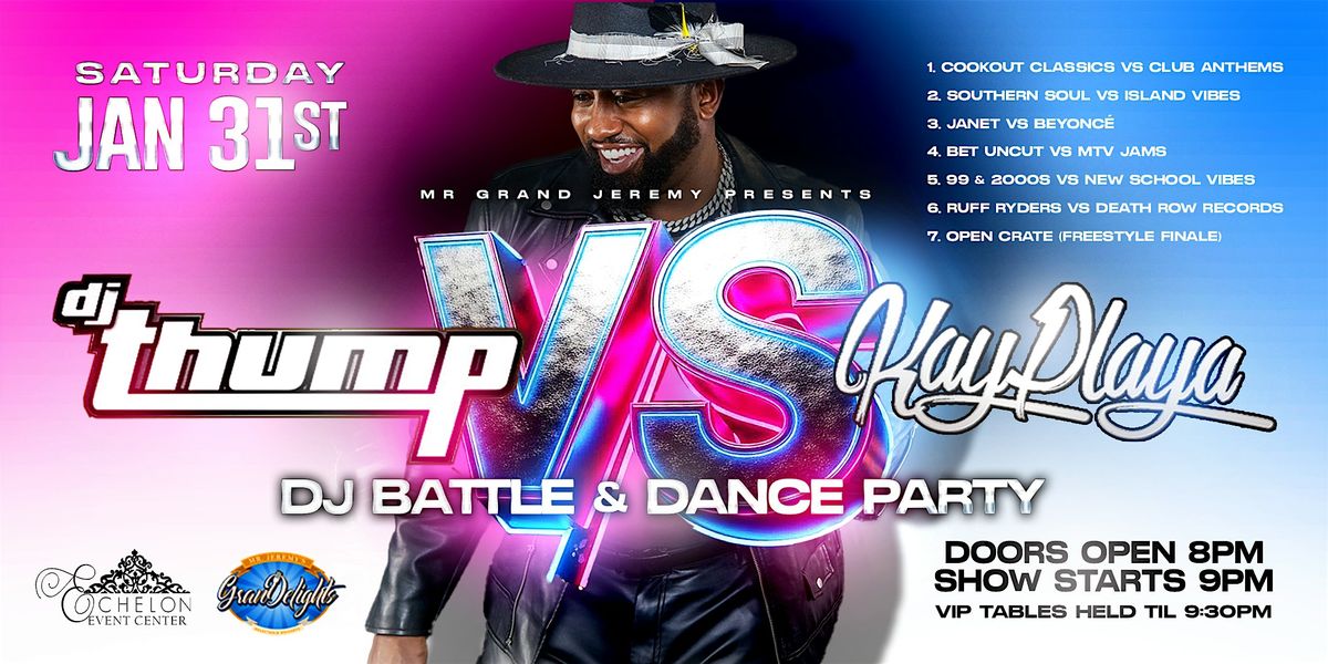 Mr. Grand Jeremy presents an epic DJ Battle & Dance Party featuring: DJ Thump vs Kay Playa, going head-to-head across eras, genres, and vibes.