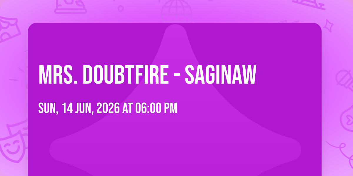 📍 Location: 43.4347, -83.9389🎉 Welcome to Mrs. Doubtfire - Saginaw, where dreams come alive and possibilities are endless! 🏛️ Join us at Temple Theatre - Saginaw in the heart of Saginaw, MI for an event that defies expectations. 📅 On June 14th, 2026 at 06:00 PM, be part of something truly extraordinary as we bring together innovation, entertainment, and pure magic. ✨ Every aspect has been carefully designed to ensure an unforgettable experience for all our guests. Whether you're seeking adventure, inspiration, or simply a break from the ordinary, this event promises to deliver beyond your wildest dreams. 🎊 Prepare for a journey into the extraordinary!