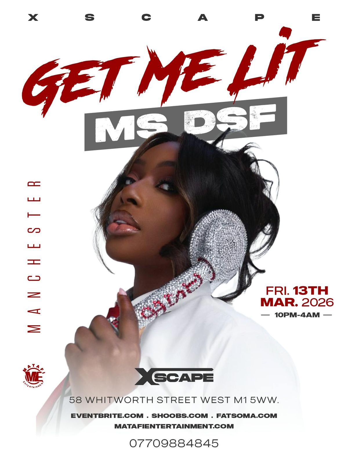 Get ready for a high-energy night like no other as MS DSF lands in Manchester with her electrifying βGET ME LITβ experience!Join us on Friday 13th March 2026, from 10PM β 4AM, as Xscape Manchester transforms into the ultimate party destination, delivering nonstop vibes, heavy beats, and pure nightlife energy. Expect a thrilling blend of Afrobeats, Hip-Hop, Amapiano, RnB, and Dancehall, guaranteed to keep you moving all night long.