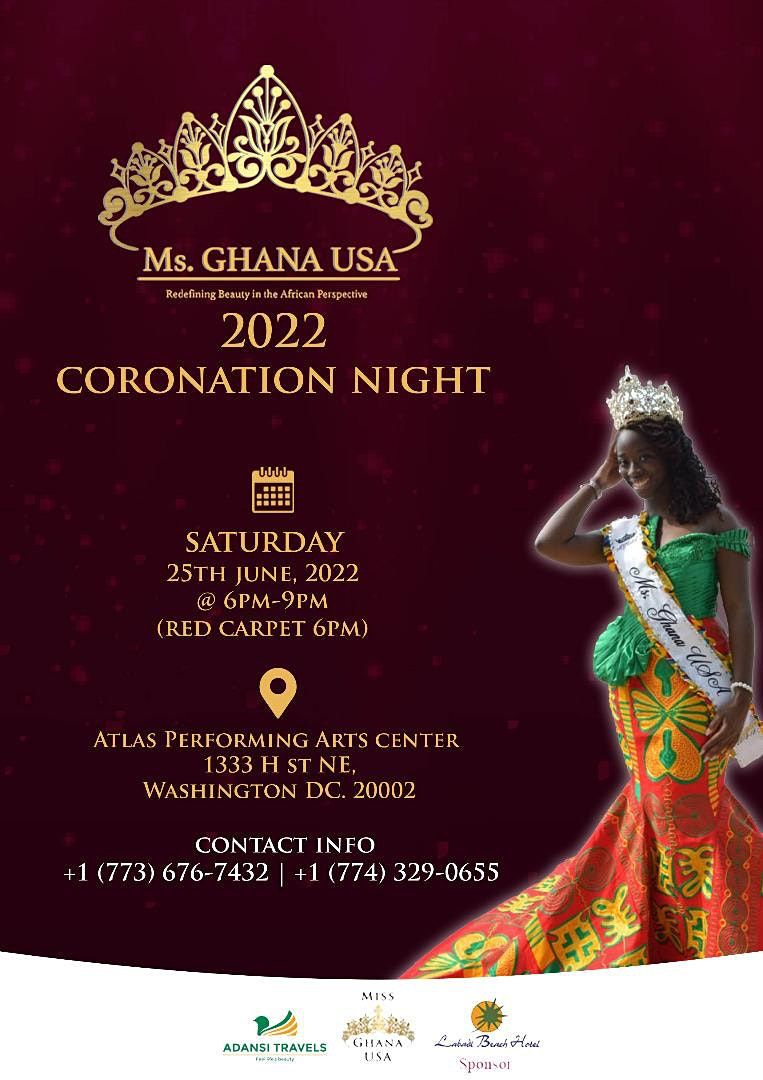 Ms Ghana USA 2022 Pageant Night happening at The Atlas Performing Art Center (1333 H St. NE. Washington D.C. 20002) on Saturday, June 25th, 2022 from 6:00 p.m. to 9:00 p.m.