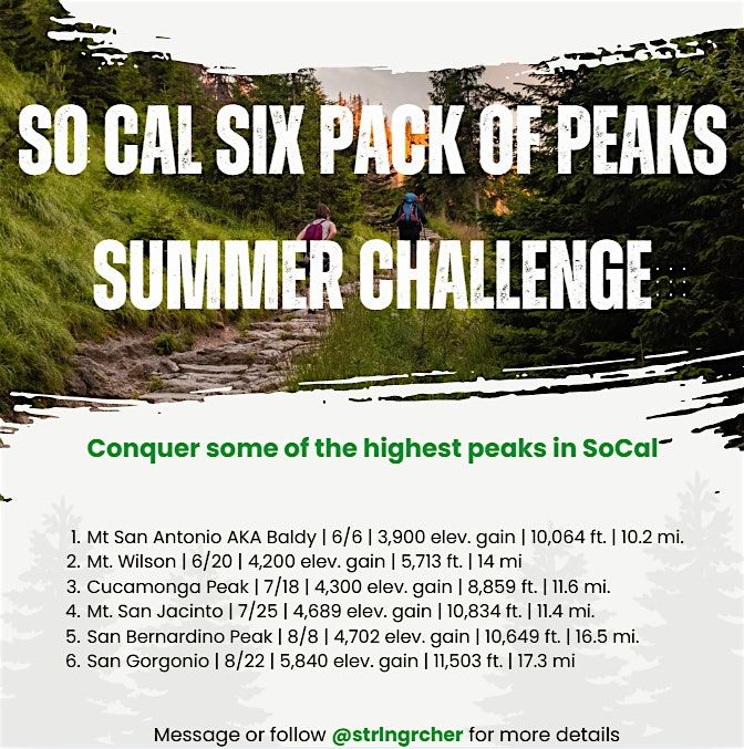 Hey! I'm Tony and I'm doing the SoCal Six-Pack of Peaks challenge this summer and I'm inviting anyone up for a challenge to join me. We're tackling two peaks per month over June, July and August starting with the shortest elevation gain and ending with the highest.