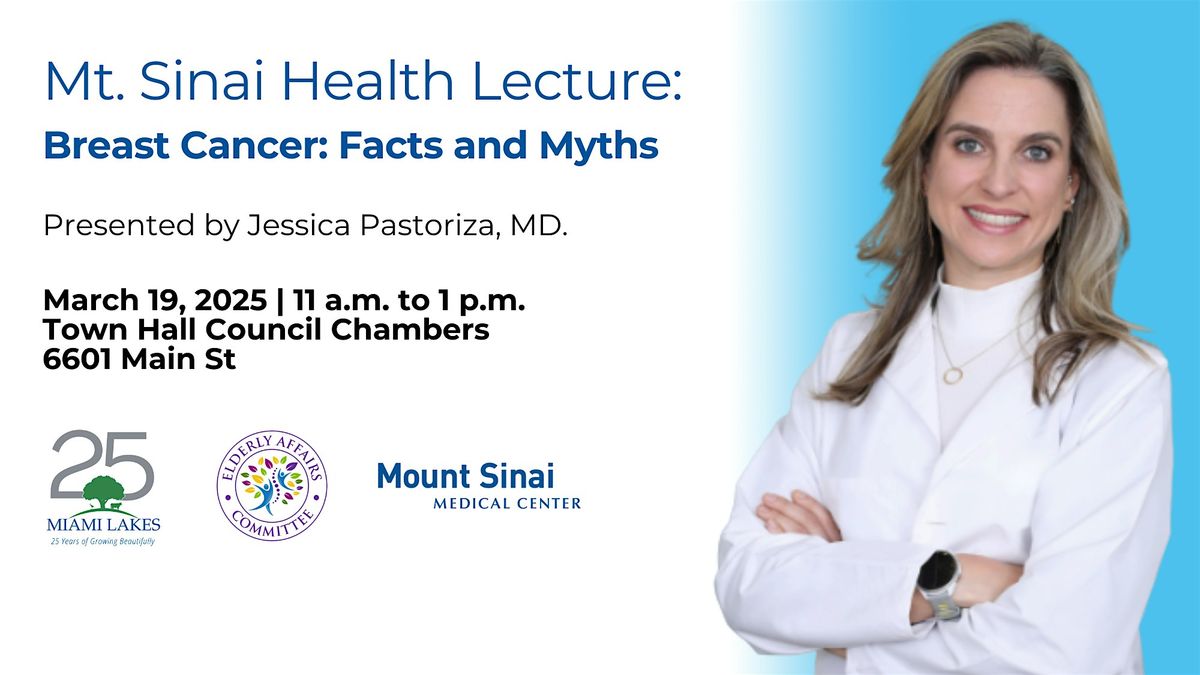 Thanks to Mount Sinai Medical Center, through the work of our Elderly Affairs Committee, we are happy to invite you to a health lecture on breast cancer, presented by Dr. Jessica Pastoriza, MD.