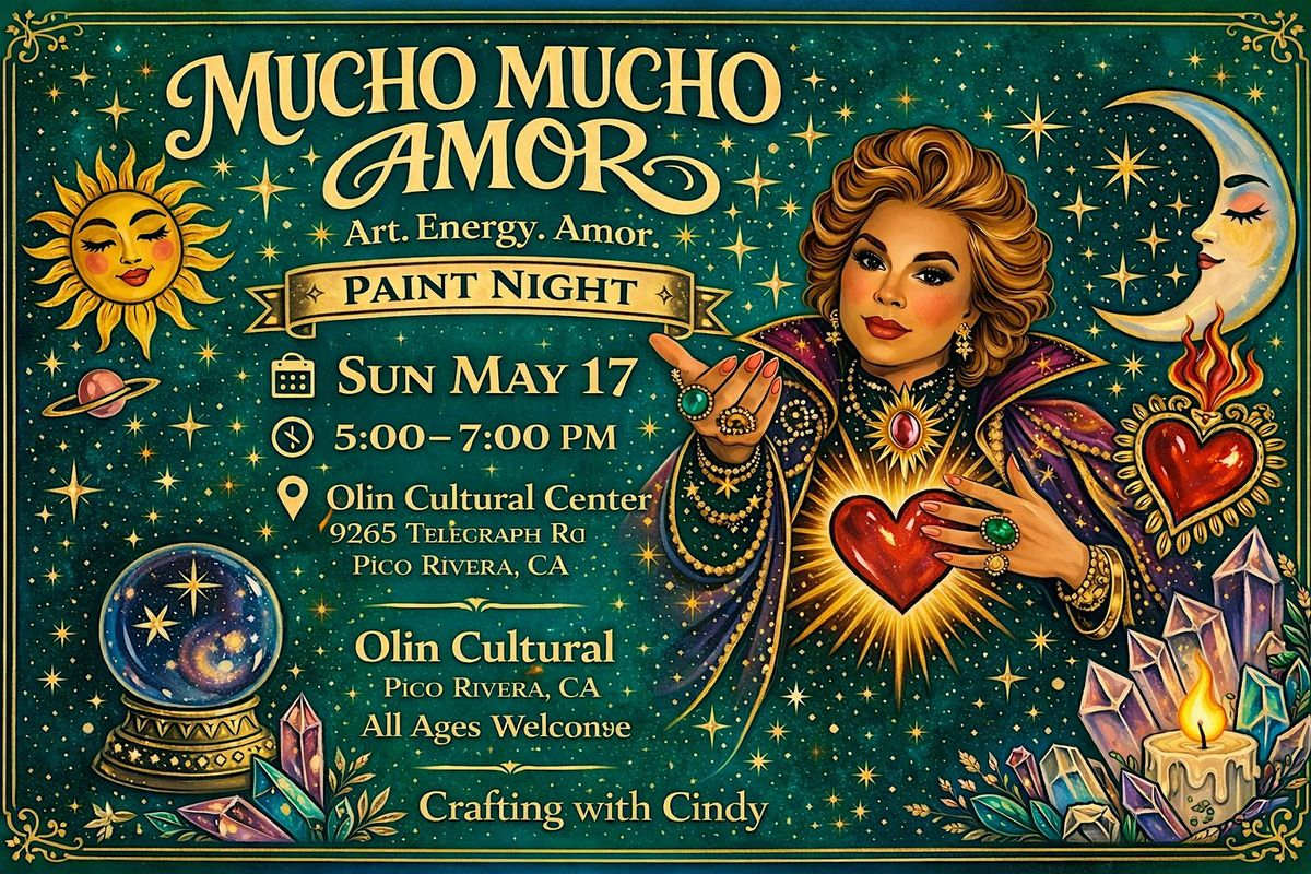Join us for a vibrant evening of creativity as we paint the beautiful Mucho Mucho Amor design inspired by sacred hearts, cosmic symbols, and mystical energy.