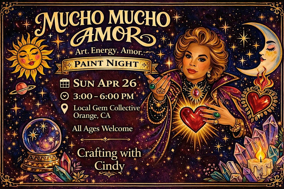 Join us for a vibrant evening of creativity as we paint the beautiful Mucho Mucho Amor design inspired by sacred hearts, cosmic symbols, and mystical energy.