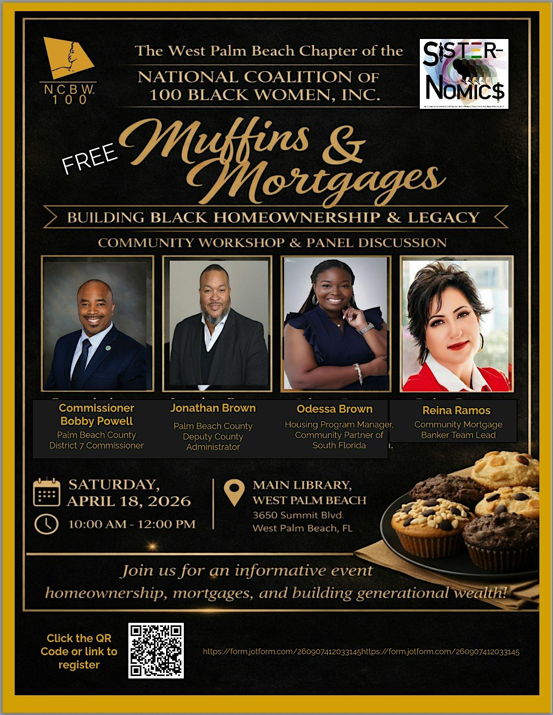 The path to homeownership starts with information, access, and the right people in the room. Join the National Coalition of 100 Black Women, West Palm Beach Chapter, for Muffins & Mortgages: a free community workshop and panel discussion focused on building Black homeownership and legacy. We will feature local leaders and housing professionals sharing practical insight on mortgages, homeownership, and generational wealth.