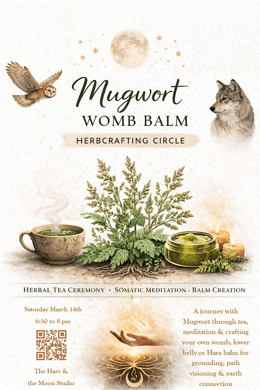 Join us for a ritual with Mugwort where we’ll create a nourishing balm for the energetic womb space, also known in some traditions as the Hara. This space is the seat of creativity, emotional processing, grounding, and life force. This gathering invites you to connect with the lower gate center of power, softness, and transformation
