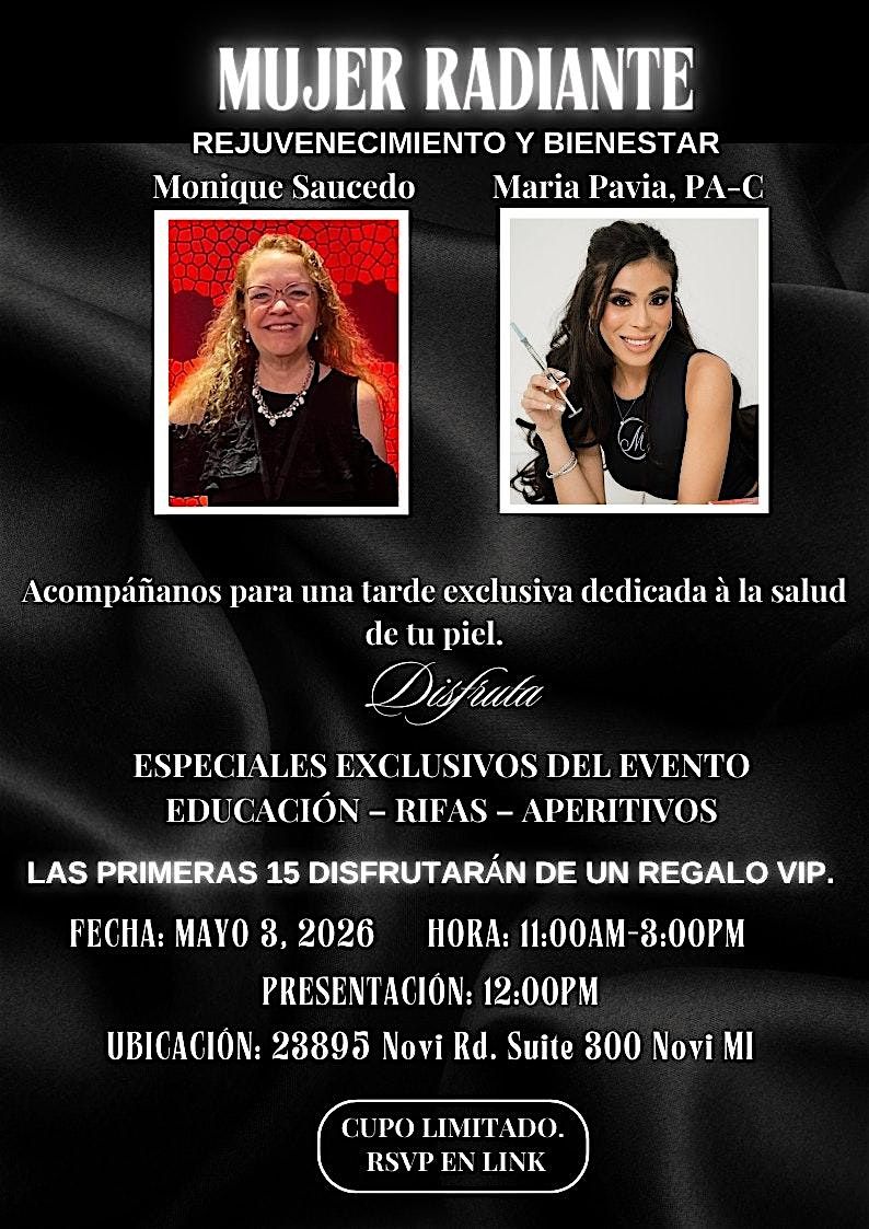 Ven y disfruta de una experiencia única. Este evento presencial está diseñado para exclusivamente MEXICANAS EN MICHIGAN de rejuvenecimiento y bienestar que te harán brillar por dentro y por fuera.