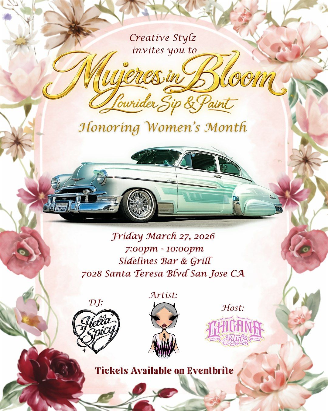 Creative Stylz invites you to Mujeres in Bloom, a special Lowrider Sip & Paint celebrating Women’s Month with an evening of art, music, and community in San Jose.