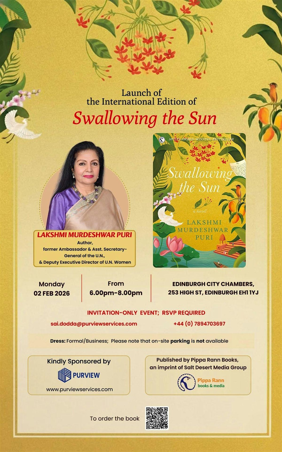 I'm bringing my first book publication to Edinburgh, and this will be the first in the series of international launches of the best-selling and multiple-prize-winning Indian novel, "Swallowing the Sun".