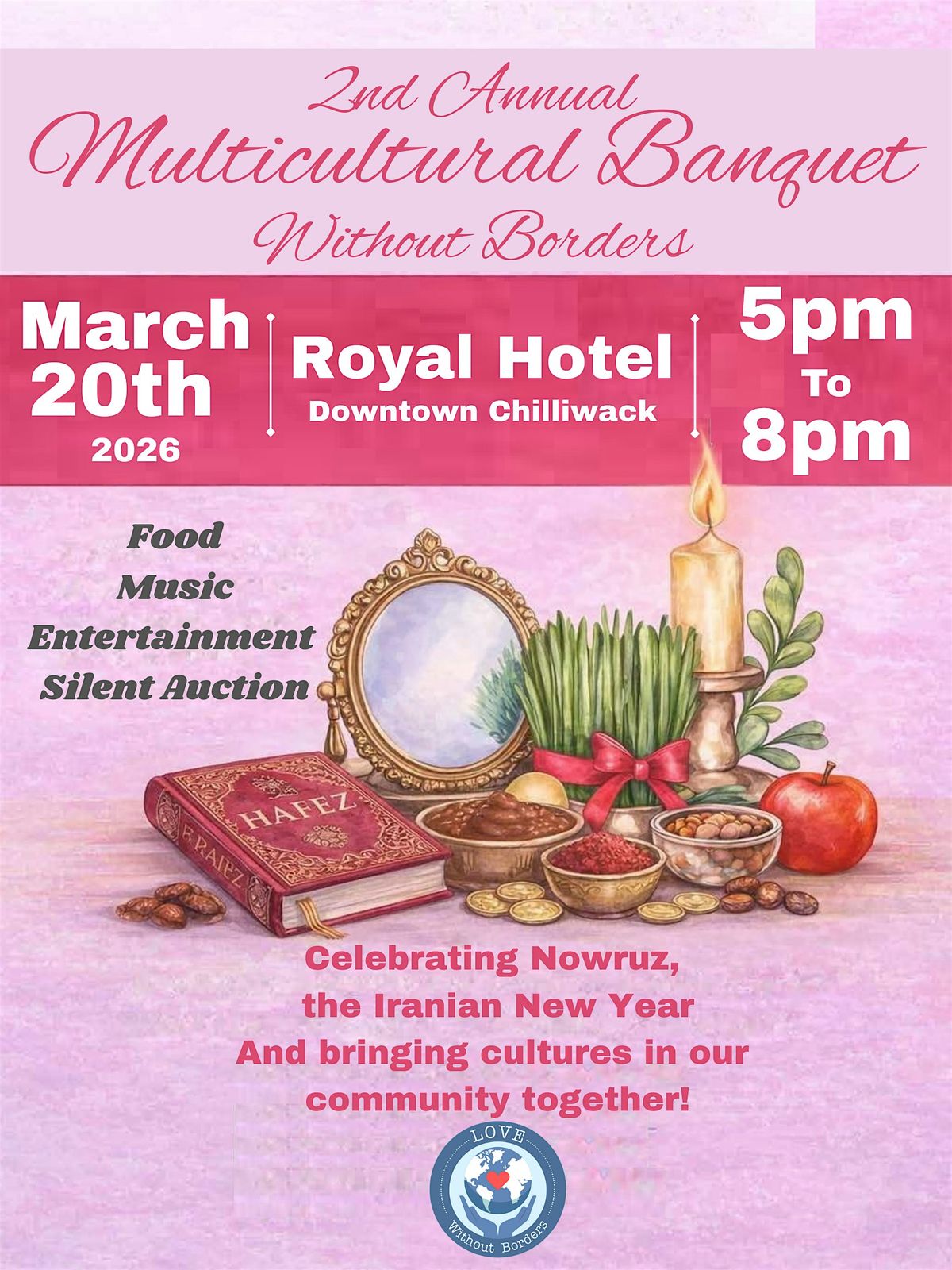 This Banquet celebrates Nowruz, the Iranian New Year. Nowruz celebrates spring as the New year across 13 countries, and we are excited to share this culturally diverse event with the community! This event will also bring many cultures in our community together, represented by food, music and entertainment, and we hope you can join us in celebrating the uniqueness and diversity of Chilliwack!