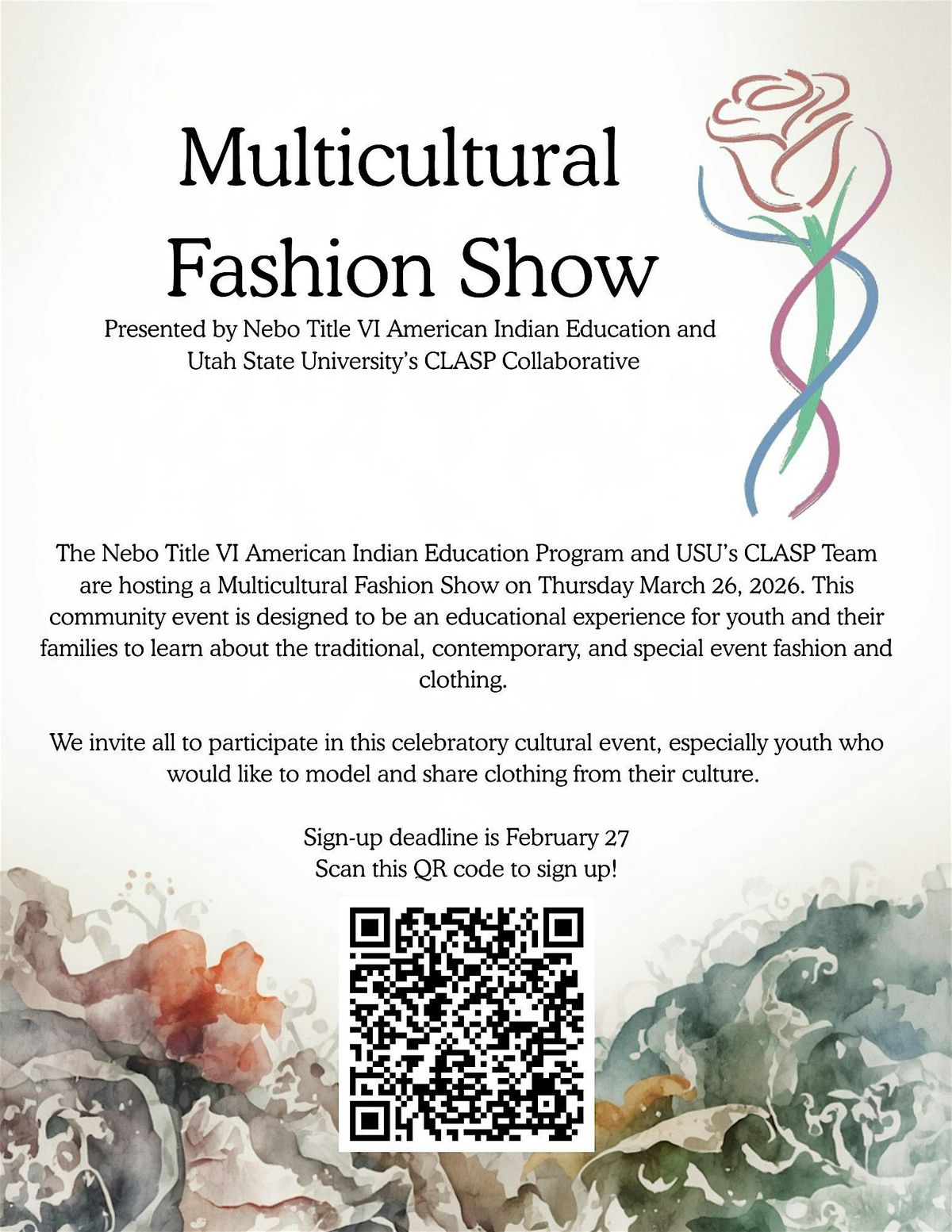 The Nebo Title VI American Indian Education Program and USU CLASP are hosting a Multicultural Fashion Show on March 26, 2026 from 6-8 pm. This community event is designed to be an educational experience for youth and their families to learn about the traditional, contemporary, and special event fashion and clothing. We invite ALL AGES to this event. Doors will open at 5:30 pm, and we kindly ask attendees to be seated by 6pm.