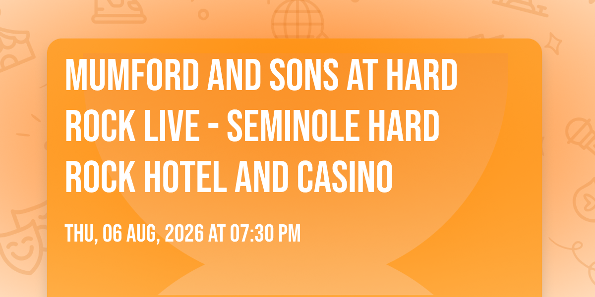 🌟 Journey into wonder at Mumford and Sons at Hard Rock Live - Seminole Hard Rock Hotel and Casino, where extraordinary experiences await around every corner! 🏛️ Set against the backdrop of Hard Rock Live - Seminole Hard Rock Hotel and Casino in dynamic Hollywood, FL, this event promises to exceed all expectations. 📅 Join us on August 6th, 2026 at 07:30 PM for a celebration that combines innovation, entertainment, and community spirit in perfect harmony. ✨ There will be an atmosphere where memories are made and stories come alive, ensuring every guest experiences something truly remarkable. 🎊 This is more than just an event; it's a journey into the extraordinary!