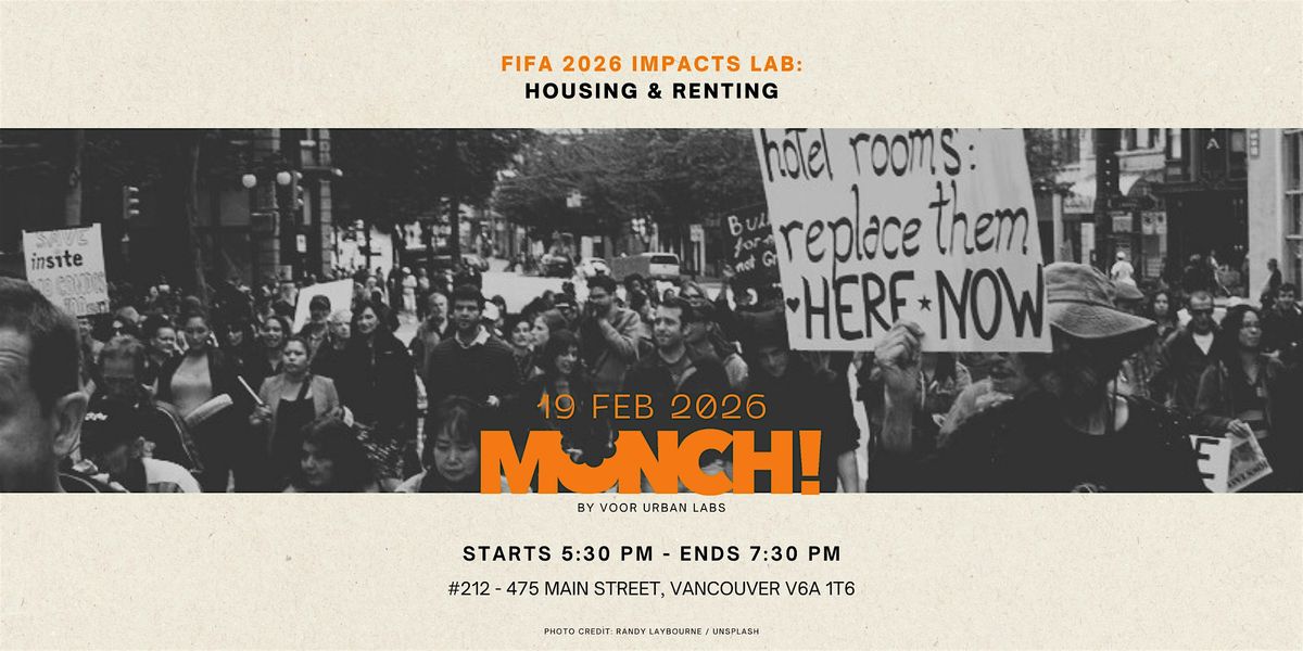 Voor Urban Labs invites you to a new season of Munch focused on improving the City of Vancouver’s Sustainability and Human Rights Strategy for the 2026 FIFA World Cup. Let’s hear from subject experts and participate in the discussion as we collaborate to assess how important issues in Vancouver are included or excluded from the City’s planning for the World Cup. These sessions serve as a collaborative laboratory where we move beyond mega event promises to establish the Community Playbook—a set of policy standards and accountability metrics designed to deliver benefits and accountability for the $700M municipal investment.