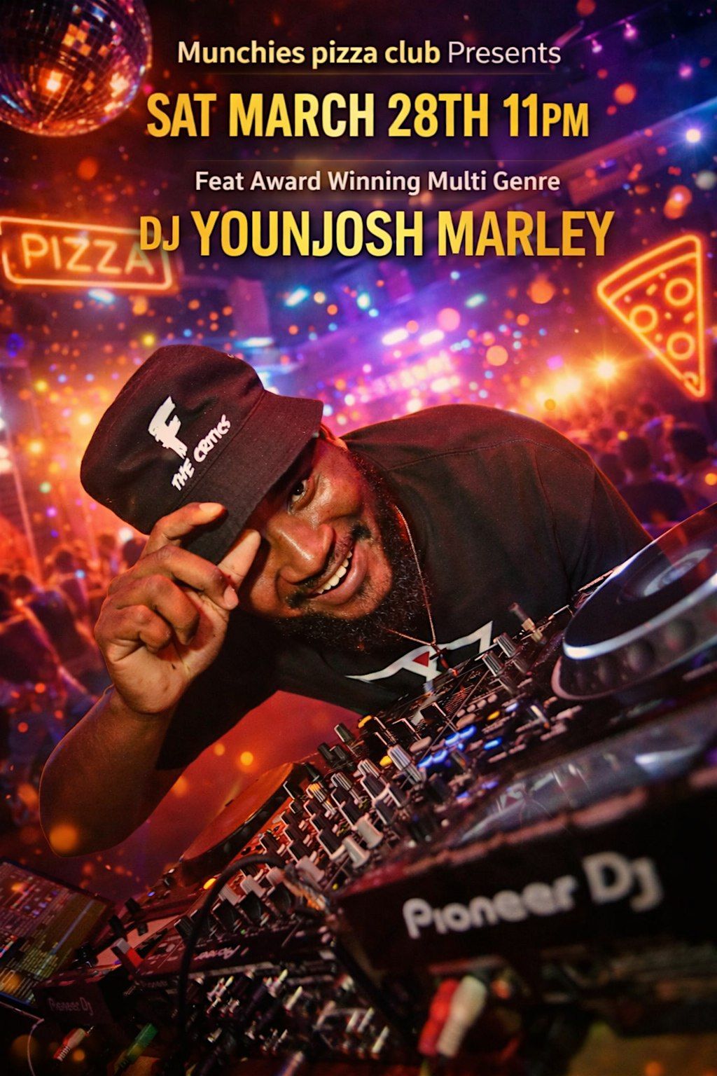 Get ready for an epic night in person at the Munchies Pizza Club Saturday featuring the talented Younjosh Marley! Enjoy great vibes, tasty pizza, and live tunes all night long. Bring your crew, come hungry, and let's make it a Saturday to remember!